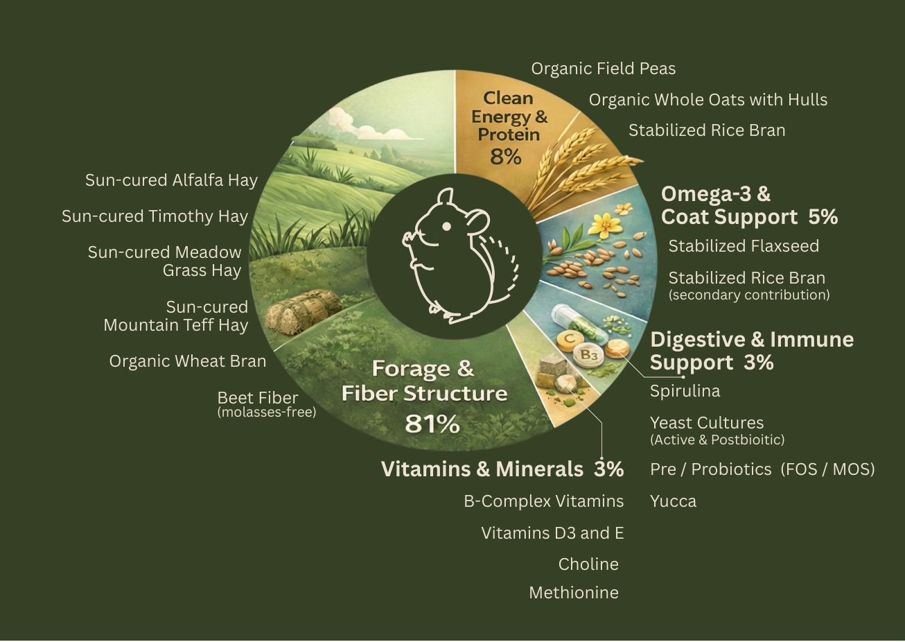 This page explains the role of each ingredient used in the Niblee Chinchilla formula and why it was selected. Every ingredient contributes a specific nutritional or functional purpose, from fiber structure and fermentation support to mineral balance and gut stability. This is not a marketing list. It is a breakdown of how each component supports species-appropriate nutrition.